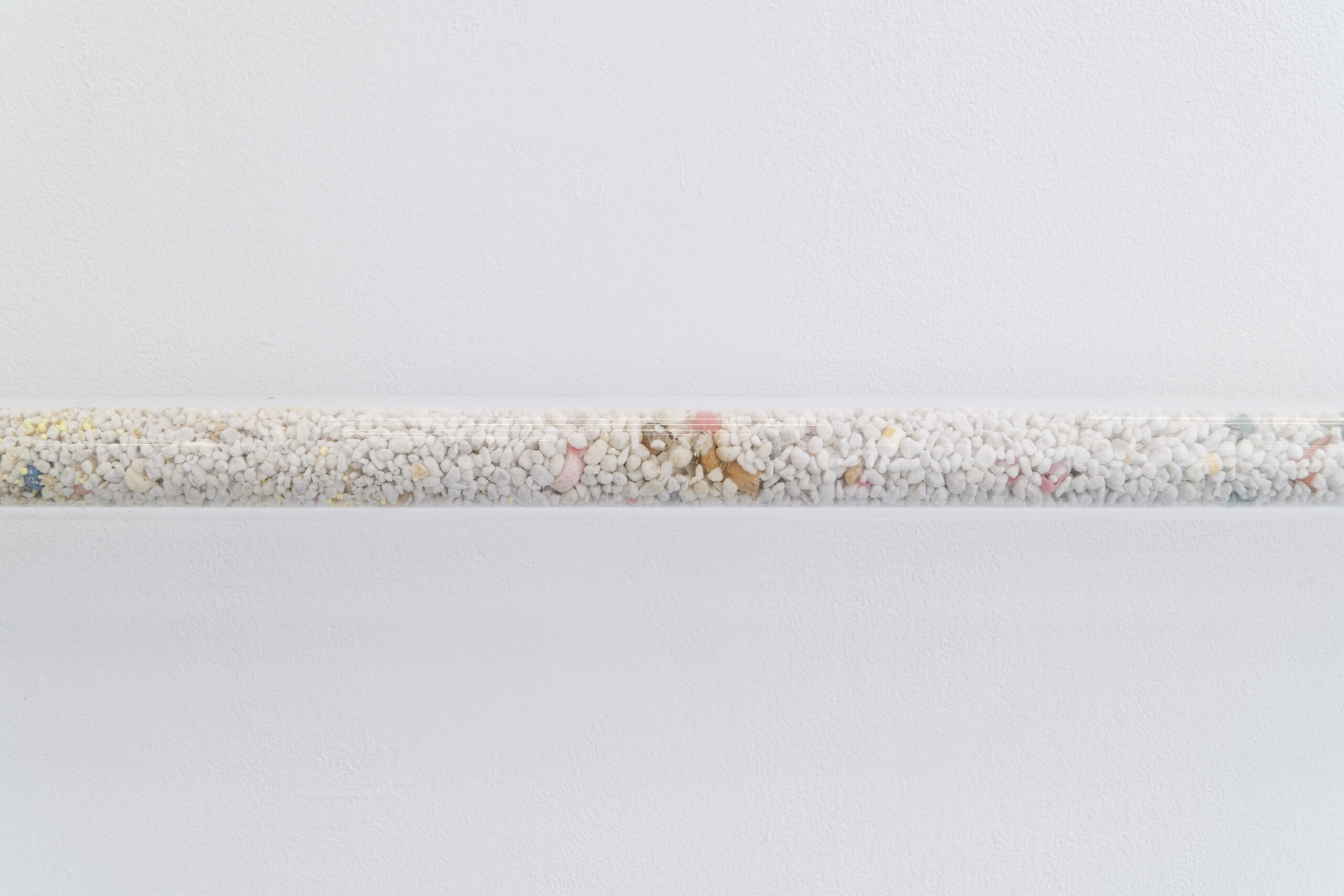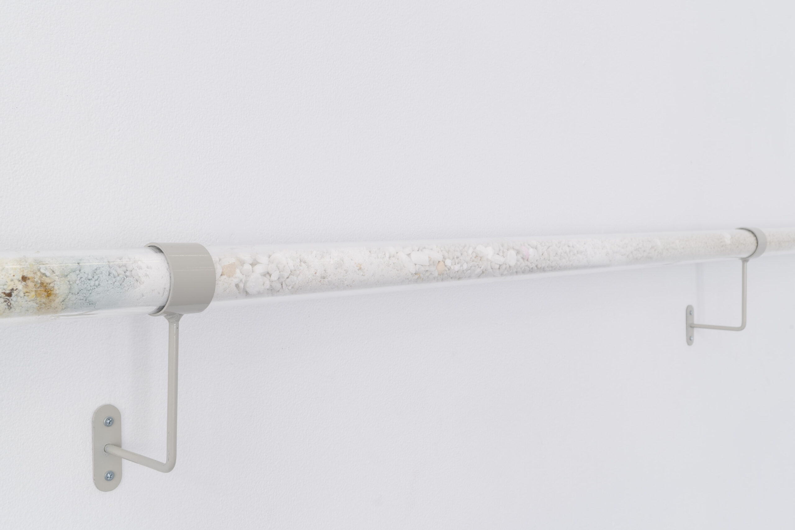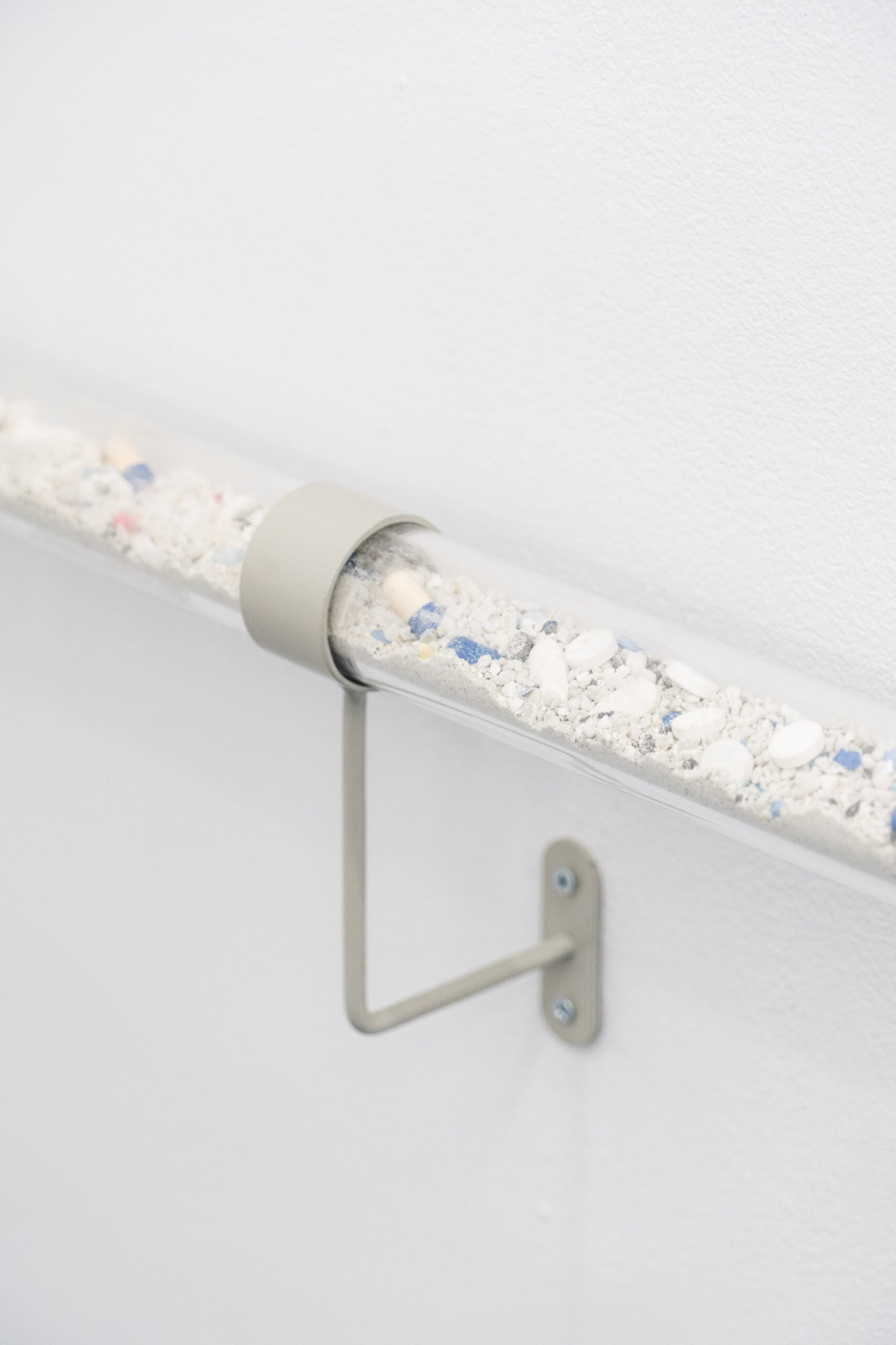 Bliskość tę odczuwać możemy wielowymiarowo – zarówno w warstwie estetyki, jak i materii. Język wizualny Bimera wykorzystujący obrazy ze świata nauki i mikrobiologii, na pierwszy rzut oka może wydawać się abstrakcyjny. Obrazy medyczne są trudne do odczytania, budzą poczucie odrealnienia, obcości i dehumanizacji, a przecież w rzeczywistości stanowią głęboko osobisty portret ludzkiego organizmu. W krzesłach, zatytułowanych Employed Time (Czas poświęcony) niczym w zdjęciach rentgenowskich, odczytujemy kształty szkieletu, w mikro i makro skali, a jednocześnie stają się one przedłużeniem naszego ciała, przyjmując je i podtrzymując. Złożona z elementów przypominających szkiełka laboratoryjne, pokrytych tabletkami i minerałami naturalnie obecnymi w ciele, praca Kwiecień wręcz nasycona jest życiem w jego biologicznym wymiarze. Przezroczysta poręcz Lifespan (Czas życia) wypełniona mieszanką medykamentów, witamin, nawozów, pestycydów, mikro plastiku i innych sypkich substancji staje się przekrojem odpadów naszej cywilizacji – geologicznym świadectwem kultury.