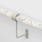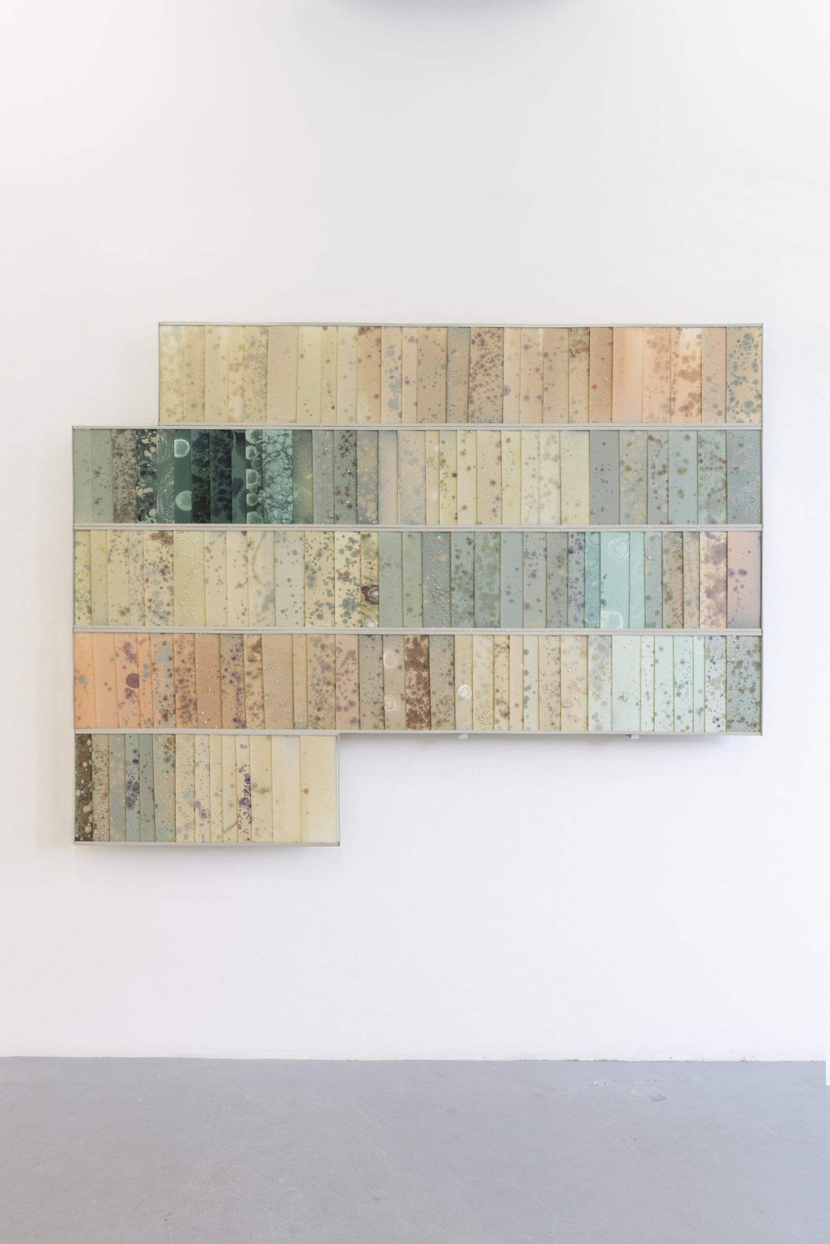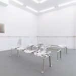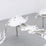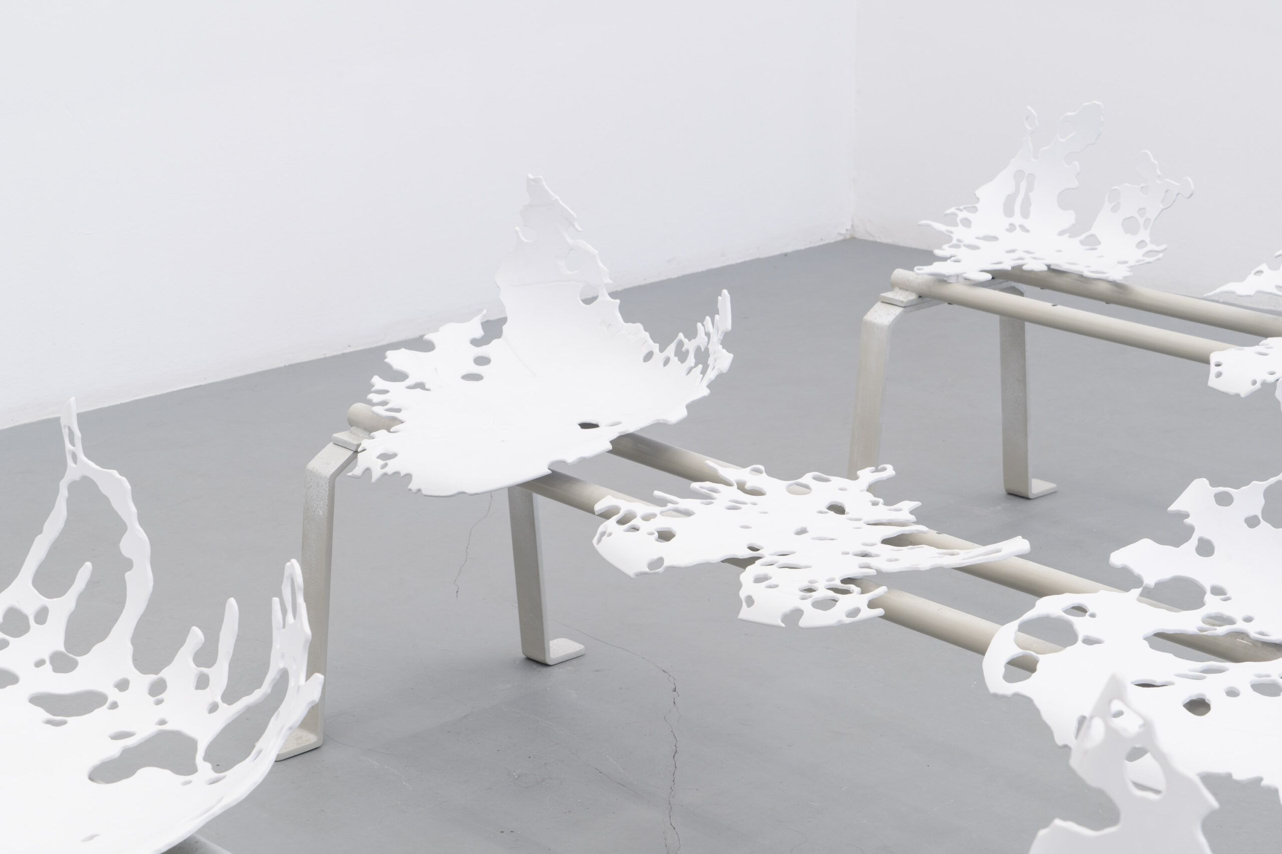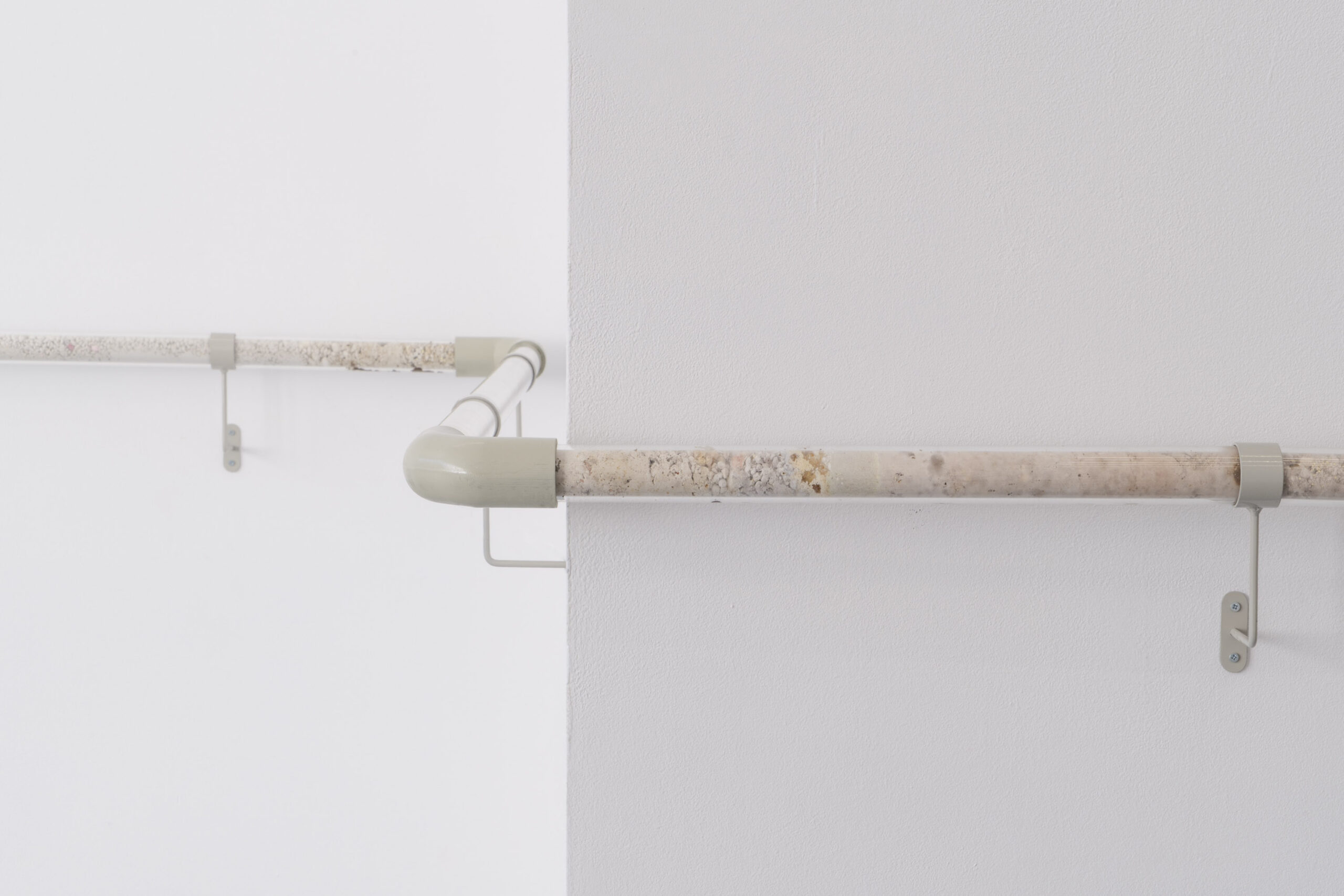 Bliskość tę odczuwać możemy wielowymiarowo – zarówno w warstwie estetyki, jak i materii. Język wizualny Bimera wykorzystujący obrazy ze świata nauki i mikrobiologii, na pierwszy rzut oka może wydawać się abstrakcyjny. Obrazy medyczne są trudne do odczytania, budzą poczucie odrealnienia, obcości i dehumanizacji, a przecież w rzeczywistości stanowią głęboko osobisty portret ludzkiego organizmu. W krzesłach, zatytułowanych Employed Time (Czas poświęcony) niczym w zdjęciach rentgenowskich, odczytujemy kształty szkieletu, w mikro i makro skali, a jednocześnie stają się one przedłużeniem naszego ciała, przyjmując je i podtrzymując. Złożona z elementów przypominających szkiełka laboratoryjne, pokrytych tabletkami i minerałami naturalnie obecnymi w ciele, praca Kwiecień wręcz nasycona jest życiem w jego biologicznym wymiarze. Przezroczysta poręcz Lifespan (Czas życia) wypełniona mieszanką medykamentów, witamin, nawozów, pestycydów, mikro plastiku i innych sypkich substancji staje się przekrojem odpadów naszej cywilizacji – geologicznym świadectwem kultury.