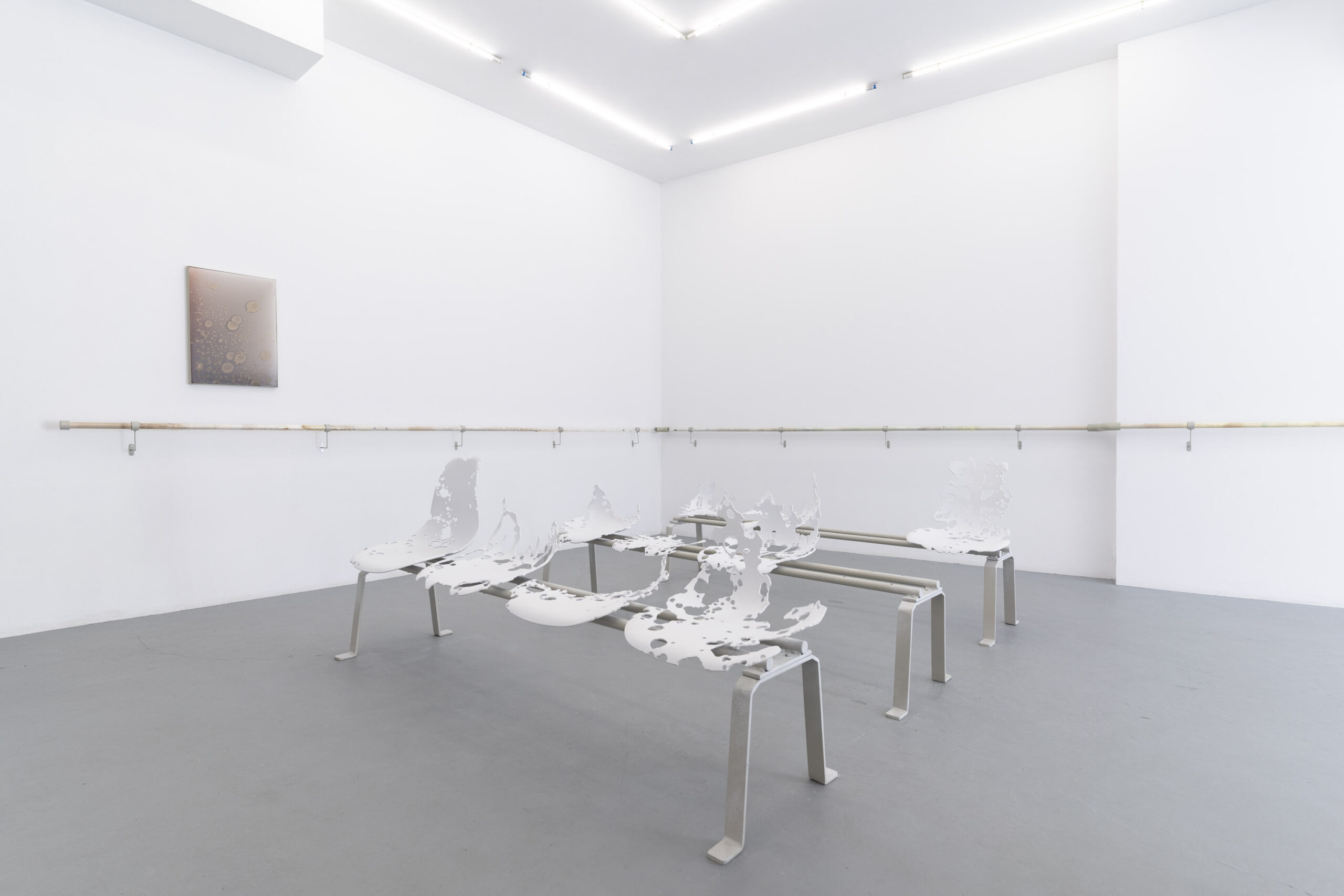 Czas na wystawie jest niemal tak namacalny jak sama materia. Traci granice, rozlewa się, przekracza typowe ramy kalendarza. W tym świecie doświadczenie zawieszenia i oczekiwania splata się z jego upływem, z przemijaniem. Rytm ten przerywają prace malarskie ,które przywołują początek, źródło, narodziny – powstające w dialogu z artystą, który inicjuje proces, lecz pozwala materii samej kształtować swoją formę. Czas zawisa więc pomiędzy początkiem a końcem, powstawaniem materii i jej zanikiem, życiem i kruchością tego, co nie może oprzeć się zużyciu.